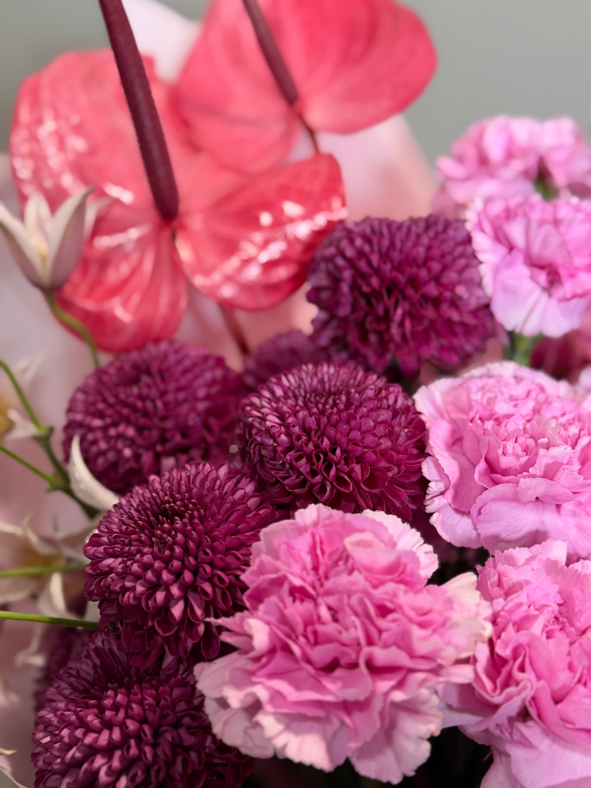 Make a statement with our premium Mauve Blush bouquet, handcrafted in a soft lilac and pink palette with bold, sculptural contrast. Featuring rich chrysanthemum blooms, elegant snapdragons, glossy anthurium, ruffled carnations and delicate clematis, this bouquet is designed with modern texture, height and effortless movement.